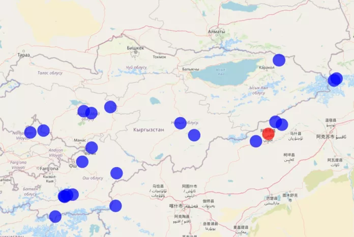 Очаг землетрясения располагался в Китае (на карте отмечен красным). Сильнее всего в Кыргызстане его ощутили в селе Бедель (40 км от эпицентра), а также на руднике Кумтор — около четырёх баллов, в Бишкеке — около трех.