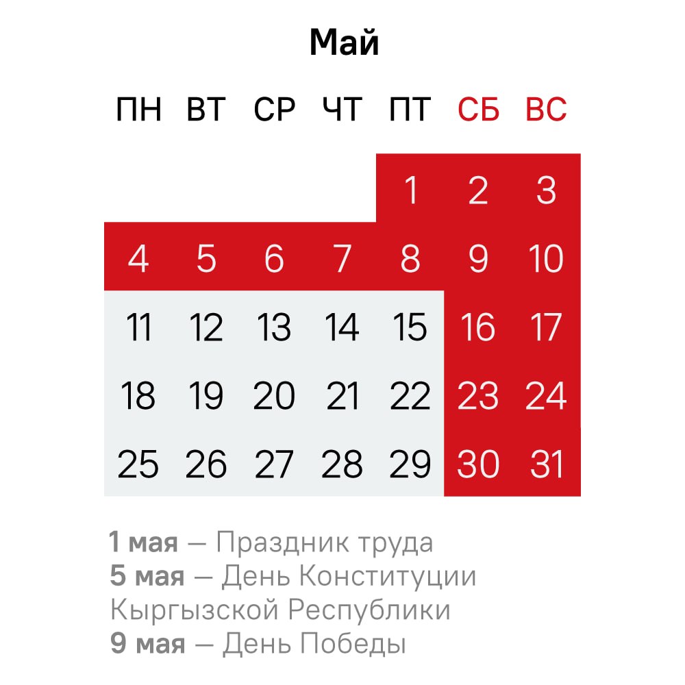 Пятница выпадает на 1 мая, то есть на длинные каникулы, которые с учетом выходных продлятся до 10-го числа. Таким образом, на этой неделе кыргызстанцы отработают четыре дня — с понедельника по четверг (27–30 апреля).