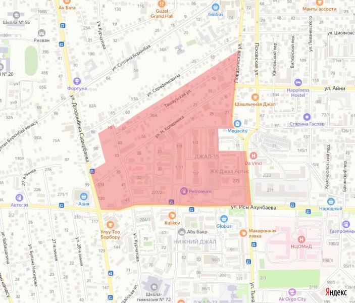 Район отключения: ул. Ахунбаева – ул. Ташаузкая – ул. Тыналиева – ул. Садырбаева.